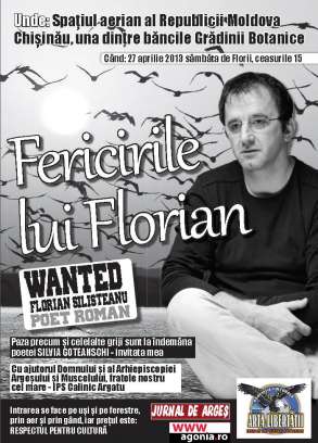 Când: 27 aprilie 2013 sâmbăta de Florii, ceasurile 15 Fericirile lui Florian WANTED: FLorian Silișteanu poet român Intrarea se face pe uși și pe ferestre, prin aer și prin gând, iar prețul este: RESPECTUL PENTRU CULTURÃ