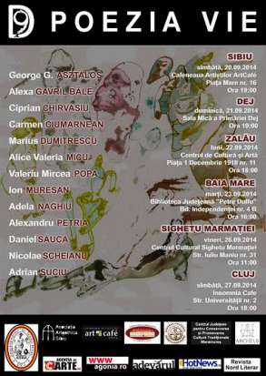 - - - - - - - - - - - - - - - - - - - - - - 2014-09-18 | | Asociația Culturală Direcția 9 organizează un turneu de lecturi publice de poezie în orașele Sibiu, Dej, Zalău, Baia Mare, Sighetu Marmației și Cluj, în perioada 20 – 27 septembrie, după următorul program: Sîmbătă, 20 septembrie 2014 Sibiu Cafeneaua Artiștilor Art Cafe Piața Mare nr. 16, ora 19.00 Duminică, 21 septembrie 2014 Dej Sala Mică a Primăriei Dej Str. 1 Mai, nr. 2, ora 17.00 Luni, 22 septembrie 2014 Zalău Centrul de Cultură și Artă al Județului Sălaj Piața 1 Decembrie 1918 nr. 11, ora 18.00 Marți, 23 septembrie 2014 Baia Mare Biblioteca Județeană ”Petre Dulfu” Bd. Independenței nr. 4 B, ora 16.00 Vineri, 26 septembrie 2014 Sighetu Marmației Centrul Cultural Sighetu Marmației Str. Iuliu Maniu nr. 31, ora 11.00 Sîmbătă, 27.09.2014 Cluj Insomnia Cafe Str. Universității, nr. 2 Participă peste douăzeci de poeți din generații diferite, de la tineri debutanți pînă la poeți consacrați. Vor fi lansate și prezentate publicului șase volume de poezie publicate cu sprijinul Asociației Culturale Direcția 9. Cu aceeași ocazie, vor fi donate unor biblioteci din Dej, Zalău și Baia Mare un număr de o sută douăzeci de volume de poezie contemporană românească. Colegiul Director al Asociației Culturale Direcția 9 ![]()