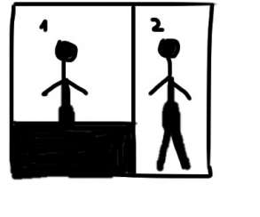 Uneori mă gîndesc dacă e bine sau nu că nu i-am făcut creaturii o fotografie. Mă gîndesc că omul nu este dator să distrugă corola de minuni a lumii cu înregistrări ale imaginii sau sunetului zilnice. Mai mult decît atît, consider că multe din relele omenirii au venit de la faptul că oamenii au inventat diferite cuști în care înregistrează trecutul observabil prin simțuri la un moment dat și, deoarece viitorul și trecutul sînt, ca orice realități perceptibile, constuite din anumite procente de viață și de moarte amestecate, atunci ele se pot regăsi la un moment dat coexistente. La fel, și lumina sau întunericul sau o imagine și negativul său. Sînt perfect conștientă că mulți vor spune că a fost o halucinație vizuală a mea, singura pe care am avut-o vreodată. Unii pot crede că a apărut ca halucinație datorită deteriorării creierului meu prin diverse substanțe care omoară, inhibă sau excită neuronii. În momentul în care s-a întîmplat au intrat unii peste mintea mea în engleză cu ideea că este o imagine holografică proiectată în fața ferestrei mele (fiindcă eu locuiesc într-un bloc în formă de U, pe latura din mijloc), în romănă cu ideea absurdă că este o armă secretă a rușilor, cu ideea că este dublul meu și voi muri fiindcă toți cei care au văzut chestia au murit ulterior (dar ei cei care spuneau aceasta, cine erau ei atunci?) sau cu ideea ulterioară că ei, cei care mă chinuiau cu obscenități țipate la fereastră în serile din jurul momentului cînd s-a petrecut, s-au speriat cînd au văzut chestia și m-au lăsat în pace. Alții spuneau că au fost obligați să spună diverse minciuni peste mintea mea ca să liniștească oamenii speriați care au văzut același lucru odată cu mine. Unii chiar insinuau că oamenii au început să creadă că eu nu aș fi om, că aș fi un fel de robot așa cum sînt camerele de luat vederi sau CD playerele, dar eu afirm că din acel punct de vedere multe femei (toate) sau bărbați pot fi roboți, părți componente asamblate în diferite mecanisme inventate de om (de obicei de bărbați) de-a lungul istoriei. ”Cuceririle” tehnice depind de sistemul social în ansamblu. Nu avem cum să ne săpăm drumul vieții, ca oameni, decît în noi înșine, chiar dacă totul pare să ne vină de-a gata de la Soare. Să vă explic puțin arătarea. Priviți desenul meu atașat. Era un om care se mișca - cu formă androgină a corpului - adică nu avea șolduri sau sîni sau talie accentuată. Am desenat cam prost, cu mouseul. Nu se vedeau haine. Se putea vedea o proporție a trupului mai degrabă asociată formelor corpului unui copil. Imaginea omului era neagră, o umbră peste lumina încăperii în care se vedea doar lumina. Tot neagră era și rama ferestrei în fața căreia stătea și tot neagră era cutia dreptunghiulară din fereastră. Cutia putea fi considerată drept ceva din fața ferestrei, care lăsa umbră în imagine. Omul se mișca rapid de la dreapta la stînga și înapoi astfel apărea în poziția 1 fără picioare și în poziția 2 în întregime. M-am speriat și m-am temut că va intra peste mine, în camera mea. Percepeam ceva agresiv. M-am găndit în mod absurd să merg în dormitor să văd dacă și acolo se vede și dacă e la fel și să aprind luminile toate sperănd că îl/o voi respinge. M-am dus și am văzut că era tot acolo. Era în fața ochilor mei, cam la 15 metri în fața ferestrei, deasupra copacilor, cam la nivelul ferestrei mele, puțin mai sus parcă. (eu nu pot aprecia corect distanțele). Multe glasuri în română mi-au spus atunci că acea creatură era Dumnezeu. Alții ziceau că e o sechelă rămasă din secolul 16. Citeam acum povestirea Celălalt a lui Borges, pe care vi-o recomand și m-am găndit să spun adevărul despre acest lucru cel puțin neplăcut. Dar, trebuie să înțelegeți că eu consider, și eu, că omul e dator să accepte lumea, universul în general, trecutul și viitorul, așa cum i se întîmplă. Dvs. l-ați fi fotografiat? Era o umbră de fapt. Acum îmi pare rău puțin că nu l-am fotografiat fiindcă mereu ați rîs de mine că mint, deși aveam toate dovezile despre ce sînt și cum m-au maltratat sau otrăvit oamenii răi, fără niciun motiv. I-am întors spatele și după vreo 10 minute poate, a dispărut și m-am dus să mă culc. Îmi fusese teamă că va intra peste mine din poziția 2, dar nu a fost așa. Acum cred că a fost un lucru bun, unul din puținele care m-au vizitat vreodată, eu fiind marginalizată. Agresivă nu era umbra, deși părea nebună prin modul în care fugea din dreapta în stînga și înapoi (asta de fapt mă speriase), ci oamenii care intraseră peste mintea mea cu idei urîte sau minciuni, deși eu nu am greșit nimic, fără niciun motiv, numai fiindcă mă ”fu...eră” și spuneau că trebuie să mă omoare fiindcă m-au fu.... Și cei care m-au respins o viață întreagă, cu ideea fixă că ”trebuie să mă omoare ca să ascundă” faptele lor, cei care neagă orice adevăr despre mine. Se pare că acea imagine era o hologramă și un vecin cu bani mulți a vrut să facă o glumă proastă.