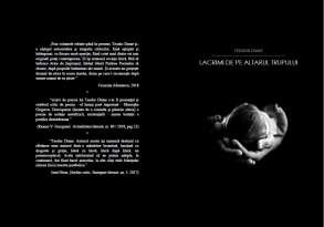 Sunteți primii cărora le dau vestea "nașterii" unei noi cărți sub semnătura aceluiași, Teodor Dume - Cartea apare la editura Pim, Iași - format 20,2/13,6 - 84 de pagini, alb-negru - copereta, Mioara Băluță - editor, Mioara Băluță Mulțumiri: - Poezie.ro - Editurii Pim - Mioarei Băluță - Tuturor semnatarilor din pagina repere critice care au lăsat semne constructive sub texte, aici pe poezie.ro, sau în diferite cronici și în mass-media - Vouă tuturor prietenilor mei care mi-ați fost alături în cei peste 10 ani de când activez pe poezie.ro spicuiri din Repere critice, (ultima parte a cărții,Lacrimi de pe altarul trupului) * Versuri de top, cu mult peste media celor publicate de alte reviste cu pretenții, semnează Teodor Dume (Marin Ifrim, Revista OPINA) * vizavi de poezia lui Teodor Dume s-ar fi pronunțat și celebrul critic de poezie - el însuși poet important - Gheorghe Grigurcu. Descoperim (înainte de a consulta și părerile altora) o poezie de notație metafizică, existențială - marea tentație a poeților dintotdeauna.” (Remus V.Giorgioni, rev.actualitatea literară,nr.80 / 2018) * Teodor Dume este un poet de mare calibru, un poet adevărat. Scrie o poezie autobiografică, încărcată de suferință și pesimism, asemănătoare cu poezia colegului său de generație, Galetaru (a se citi cronica subsemnatului despre Geo Galetaru pentru comparații și similitudini). Valoarea lui Teodor Dume este menționată și de Gheorghe Grigurcu în cuvântul înainte al cărții. La început reputatul critic afirmă că Teodor Dume, „în plan organizatoric alvalorilor, poate fi, pe durata a câtorva versuri, egalul poeziei mari”, iar către sfârșit plusează pentru valoarea autorului și nu dorește să fie contrazis „pentru că scriitura domniei sale are o capacitate asociativă și vine să confirme o simplitate de un straniu rafinament”. Cert este că opinia lui Gheorghe Grigurcu este un semn clar că autorul a urmat un drum ascendent și merită toată atenția noastră. (Ionuț Caragea, scriitor/membru USR,Revista Luceafărul) * “Teodor Dume. Autorul acesta își urmează destinul cu răbdarea unui minorit dintr-o mânăstire bizantină, însoțind cu dragoste și grație, literă cu literă, literă după literă, un poemreceptacul. Acela mărturisind că ne putem aștepta, în continuare, dat fiind harul autorului, la alte cărți utile bilanțului istoriei liricii noastre postbelice.” Ionel Bota, (Atelier critic, revista Sintagme literare nr.5) * Un autor ghidat de o filozofie morală, sentimentul religios este forța sa de caracter, este calea care adâncește, la Teodor Dume, misterul lumii (…).Poetul simte o elevație reflectând la conceptul și percepția Timpului. Þine piept, este pregătit în fața atâtor abise, consimțite, atât morale cât și fizice, ne conduce la poetul simbolist care spunea: ”am avut mereu senzația abisului, nu numai abisul somnului, dar și abisul acțiunii, al visului, al amintirii, al regretului și al remușcării, al frumosului, al numărului. Acum mă simt tot timpul amețit” (Charles Baudelaire) Ferestrele deschise de Teodor Dume sunt luminate de o candelă a frumosului, a sinceritații absolute, a unei sfințenii asumate, condiție sine qua non de a ajunge la esențele universale, poezia fiind teritoriul nelimitat al absolutului. Viata spiritului este tainică și fără Dumnezeu, autorul nu se vede pe drumul morții, cel mai semnificativ și mai profund eveniment al vieții. Poezia este accesitul transcendental, poetul refuză omul tragic, optează pentru tot ce este grațios ori sublim în acest paradis regăsit, întindere de ape liniștite «și câteodată cu resturi de durere» (Angela Nache Mamier, Scriitor – Franța, Azil într-o cicatrice,ed.Pim -Iași) * „Prin volumele editate până în prezent, Teodor Dume și-a câștigat notorietatea și simpatia cititorilor, fiind așteptat și întâmpinat, cu fiecare nouă apariție, fiind cotat unul dintre cei mai originali poeți contemporani. El își urmează vocația lirică, fără să îmbrace straie de împrumut, lăsând liberă Pasărea Poemului să zboare, după propriile îndemnuri ale inimii. Și aceasta nu greșește drumul de-ntors în acasa sinelui, drum pe care-l recunoaște după semne numai de ea știute.” (Cezarina Adamescu, durerea din spatele cărnii) Față în față cu mine azi stau față în față cu mine pentru a-mi putea da seama cât sunt adevăr cât minciună și cât sunt eu ceea ce înseamnă că fac parte din lumea lucrurilor ce încă respiră azi voi învăța cât să dau vieții cât morții și cât să las lui Dumnezeu apoi mai am de făcut un singur drum unul singur poarta o voi lăsa întredeschisă să intre toți rătăciții pământului și când moartea mă va căuta pe acasă eu voi fi departe departe departe... (Teodor Dume)