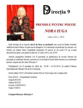 - - - - - - - - - - - - - - - - - - - - - - 2019-06-27 | | Sunt invitați să se înscrie elevii de liceu și studenții, indiferent dacă trăiesc în țară sau în diaspora. Cei interesați să participe la concurs vor trimite un singur fișier, conținând minimum 10 poezii și un scurt CV pe email directia9@yahoo.com, până la data de 15 iulie 2019, ora 24.00. Autorii grupajelor finaliste vor fi premiați cu publicarea în reviste literare de prestigiu și antologii literare, precum și cu invitații la festivaluri literare și evenimente poetice, organizate de Direcția 9. Câștigătorii vor fi anunțați în zilele de 29.08-1.09.2019, în cadrul Taberei Internaționale Poezia Vie, de la Costinești. Juriul Ediției 2019 a Premiilor pentru Poezie Nora Iuga este compus din: Nora Iuga - președintele Juriului Angela Baciu Adrian Suciu Lucian Vasilescu Tudor Voicu Colegiul Director Direcția 9 ![]()